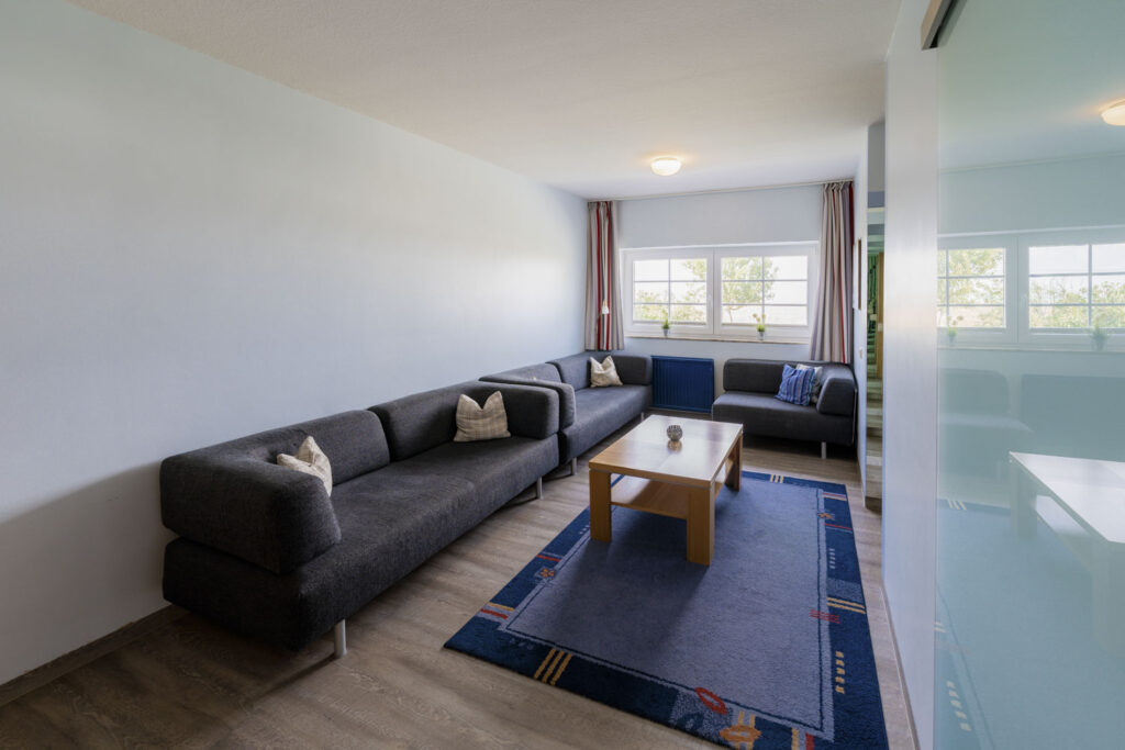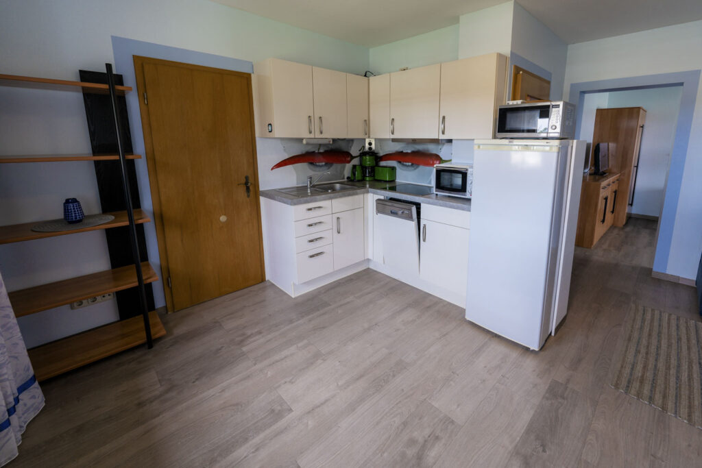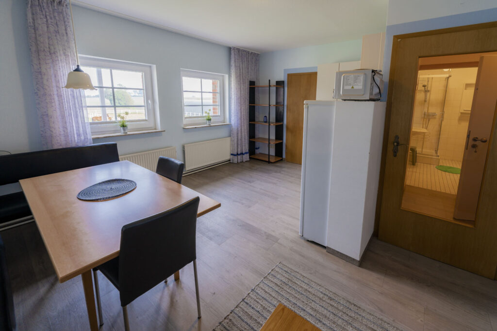 Diese großzügige Wohnung bietet eine perfekte Kombination aus Komfort und Weitblick. Der Flur führt zu einem Badezimmer, dem Wohnbereich und einer gut ausgestatteten Küche. Die zwei Schlafzimmer mit Doppelbetten sorgen für erholsamen Schlaf. Vom Wohnbereich aus genießen Sie einen malerischen Blick über die Felder bis hin zur Ostsee und zur Pferdekoppel. Ein weiteres Badezimmer rundet das Angebot ab und bietet zusätzlichen Komfort für größere Gruppen oder Familien..